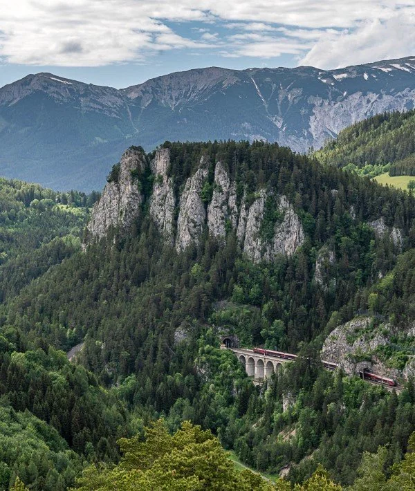 The “20 Schilling Blick” viewpoint can be reached via the railway hiking trail along the Semmering Railway, which has been recognized as a UNESCO World Heritage Site. The viewing area offers a special view of the 184 meter long and 46 meter high “Kalte Rinne” viaduct, which was shown on the back of the penultimate issue of the 20 Schilling banknote. 📍